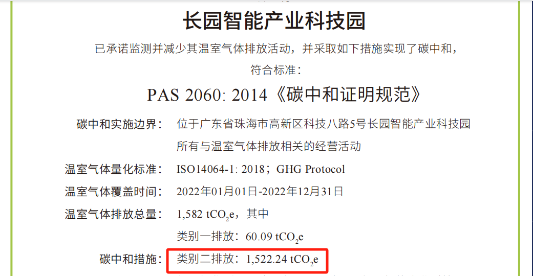 本次園區碳中和的實施,由長園科技集團旗下子公司長園綜合能源(深圳)有限公司(簡稱“長園綜能”)根據國際標準ISO 14064-1:2018《溫室氣體-第一部分 組織層面上溫室氣體排放與清除量化及報告規范》對園區類別1、類別2溫室氣體排放量進行了核算并出具核算報告,由中國合格評定國家認可委員會(CNAS)授權的第三方核證機構華測檢測(CTI),按照ISO 14064-3《溫室氣體聲明審定與核查的規范及指南》對核算報告進行了核查,并根據PAS 2060《碳中和證明規范》對碳中和結果進行了認定。