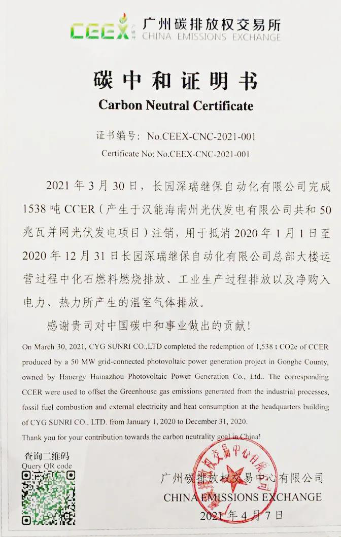2021年初,為遵循疫情防控、響應“3060碳達峰碳中和”號召,長園深瑞采用線上形式開展產品鑒定會,同時按照《大型活動碳中和實施指南(試行)》的相關要求,通過購買順昌縣“一元碳匯項目”的碳匯減排量,對該次鑒定會的二氧化碳排放量進行碳中和。今后,我們將繼續積極中和各類展會、會議等大型活動,踐行“零碳會議”理念。